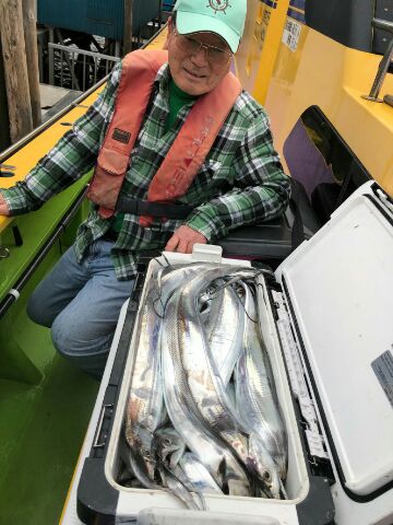 船長コメント 今日も、好調続く近場の湾奥へ。今日も朝から好調で、良型タチウオ活発。ハリス切れ多数でしたが、針金などの補強はしないように。アタリが激減しますよ。今日もほとんどの方が20本以上釣られて、皆様ニコニコ&ヘトヘトで帰られました。明日は定休日。火曜日からまた出船しますのでお待ちしております。 オモリ40号、道糸2号以下、ライトタックルでお願いいたします。