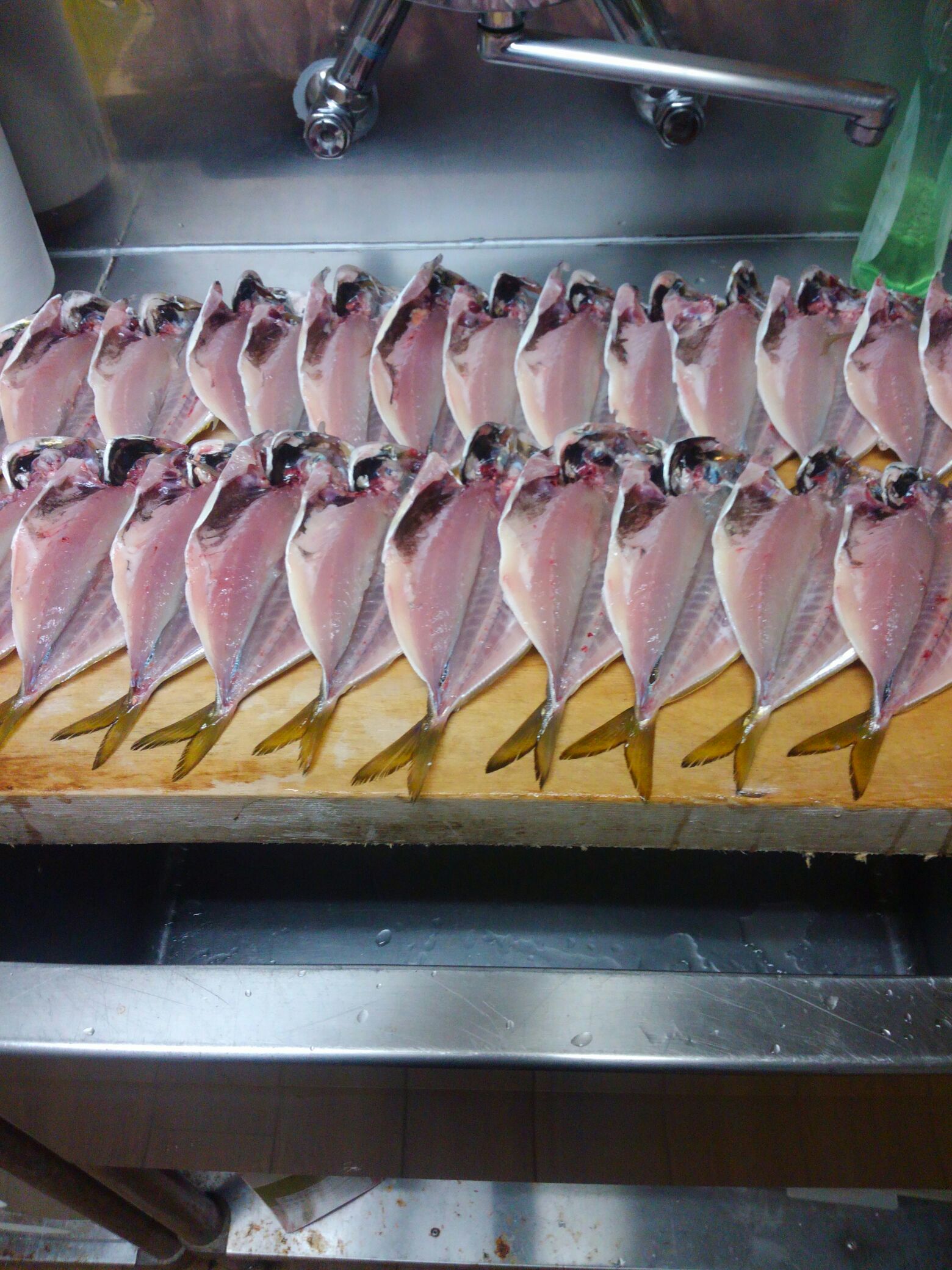 始めは、昨日と違うバース周りから。随分と浮いた反応で、水面から5メートルで良型釣れましたが慣れない方は、たまーにの当たり方・・・釣り座も関係してたかもね。移動後は、皆さんにアタリが出る活発な食いでした。今日も大型は出ませんでしたが、型はバッチリです。あまりにうまそうなアジだったので、船長も道具を出し干物用の食材確保しました。明日はいい天気なので干しますよ~。