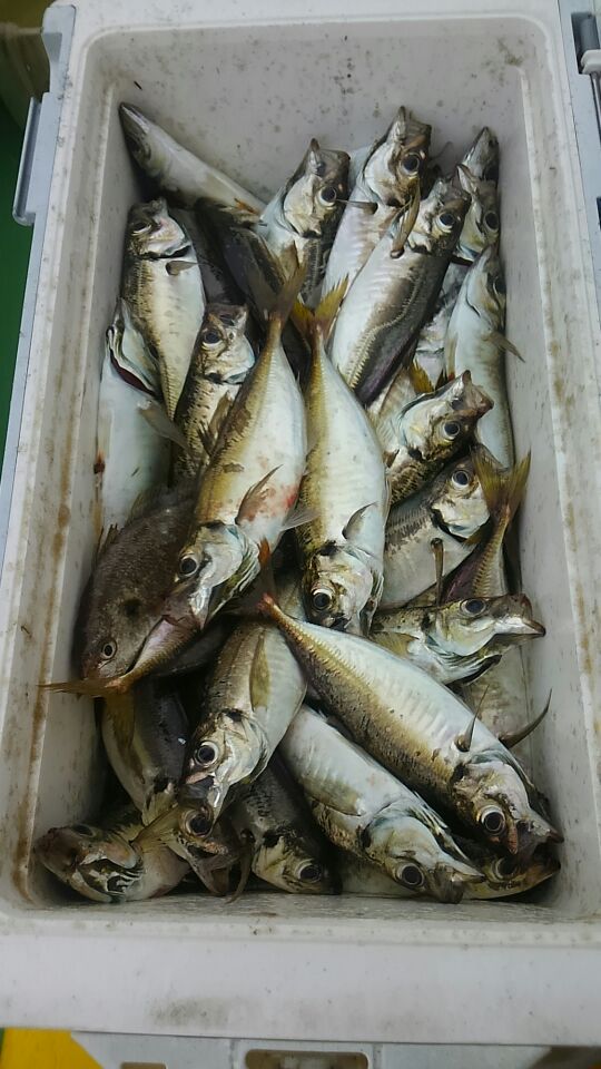 船長コメント 今日も、少人数でしたがお客様にお集まりいただき、出船することができました。 始めは、昨日と違うバース周りから。随分と浮いた反応で、水面から5メートルで良型釣れましたが慣れない方は、たまーにの当たり方・・・釣り座も関係してたかもね。移動後は、皆さんにアタリが出る活発な食いでした。今日も大型は出ませんでしたが、型はバッチリです。あまりにうまそうなアジだったので、船長も道具を出し干物用の食材確保しました。明日はいい天気なので干しますよ~。 【マスクの着用について】 熱中症予防の観点から、船上でのマスクの着用は、お客様の任意となります。 但し、受付時とやむを得ず船室を利用するときは、着用義務となります。 【船上での喫煙について】 座席での喫煙は禁止となりました。 喫煙場所は、船尾の帆柱下の通路のみになります。 携帯灰皿を持って移動してください。 【ゴミについて】 コロナ感染予防のため、各自ゴミはお持ち帰りください。