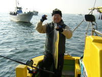 | 今日は昨日と違って朝から凪でいい陽気、おかげ様で餌釣り2隻・ルアー船1隻(タチウオ&シーバス)で出船となりました。 朝のうちは反応が広範囲にバラけてイマイチでしたが、下げ潮と共に叙々に集まりアタリも活発、昼過ぎ迄順調に続きました。 この時タナボケしちゃうとダメだね、前にも書いたけどアタリのない時は釣れてる人に聞くのが一番、船頭に聞くより正確ですよ。 終盤は昨日同様チョット難しくなったけど、反応は今日のが落ち着いてたから移動も少なかったです。 2番手が26本、お土産になった人と物足りなかった人も居ましたけど、日並みも良かったって事で次回またリベンジして下さい。 別船、2~21本 | |||||