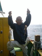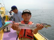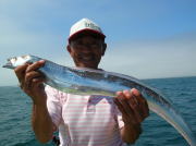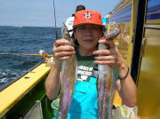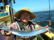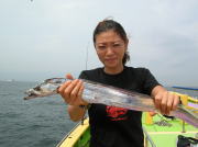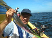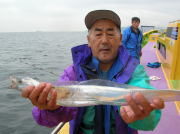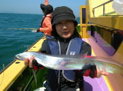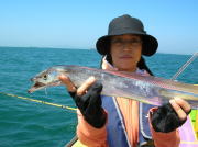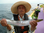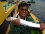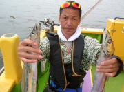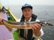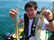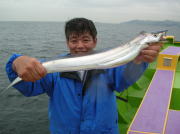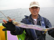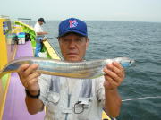 午前中タチウオ70~90センチ・0~2本、下浦沖タナ70メートル。 今日は朝から雨!おまけに肌寒く最悪~。 下浦沖を攻めましたが反応は見れてもチットも釣れませんでした。 お客様8人中6人が貸し竿初挑戦でしたが、寒さの中大健闘って言うか、運が良かったって言うか上げたらタチウオがダブルで食ってました。 他のお客様も型を見た方は居ましたが、結局ダブルで釣った方がトップでした。 日並みも悪いので早目にアジに転向しました。 午後アジ20~22センチ・6~20匹、富岡沖25メートル。 日並みが悪いのでアジは一錨でした。 スタートからポツポツ食いましたが最後までポツポツでした。 でも貸し竿チームも健闘して皆さん大満足で終了しました。 今度は日並みの良い日にまた遊びに来て下さい。